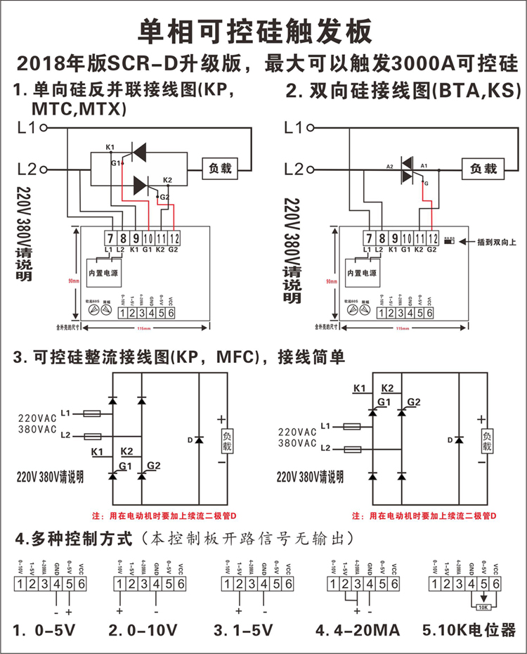 只要個(gè)信號(hào):(多種控制信號(hào)輸入:DC 4-20mA、DC 1-5V、DC 0-10V、10k電位器),就能給出線性輸出,任意調(diào)溫調(diào)速調(diào)壓。可直接觸發(fā)2000A以下的二只單向晶閘管。本控制板由高性能單片機(jī)作為控制、運(yùn)算放大器、脈沖變壓器等單元組成。可以與各種自動(dòng)化儀表配套使用,對(duì)儀表無干擾,也可以外接電位器手動(dòng)控制,廣泛應(yīng)用于負(fù)載要求連續(xù)平滑調(diào)節(jié),擰制精度較高或不允許大電流沖擊的控制系統(tǒng)。如交直流電機(jī)調(diào)速、調(diào)壓、充電等。主要用于單相純阻性負(fù)載、單相感性負(fù)載或變壓器原邊控制,如硅碳棒、硅鉬棒、電阻絲等,也可用于單相或兩相全橋半控整流,具有觸發(fā)可靠,高精度,工作穩(wěn)定,使用靈活的優(yōu)點(diǎn)。